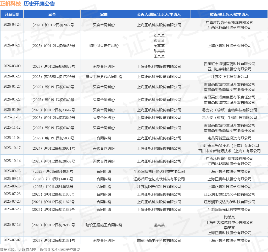案号:(2025)沪0112民初60458号根据统计,近一年内以上海正帆科技股份有限公司为当事人的历史开庭公告有30则,其中案由为“买卖合同纠纷”的公告以13则居首,其次为“合同纠纷”有10则,“承揽合同纠纷”有3则。历史开庭公告(前20条)如下: