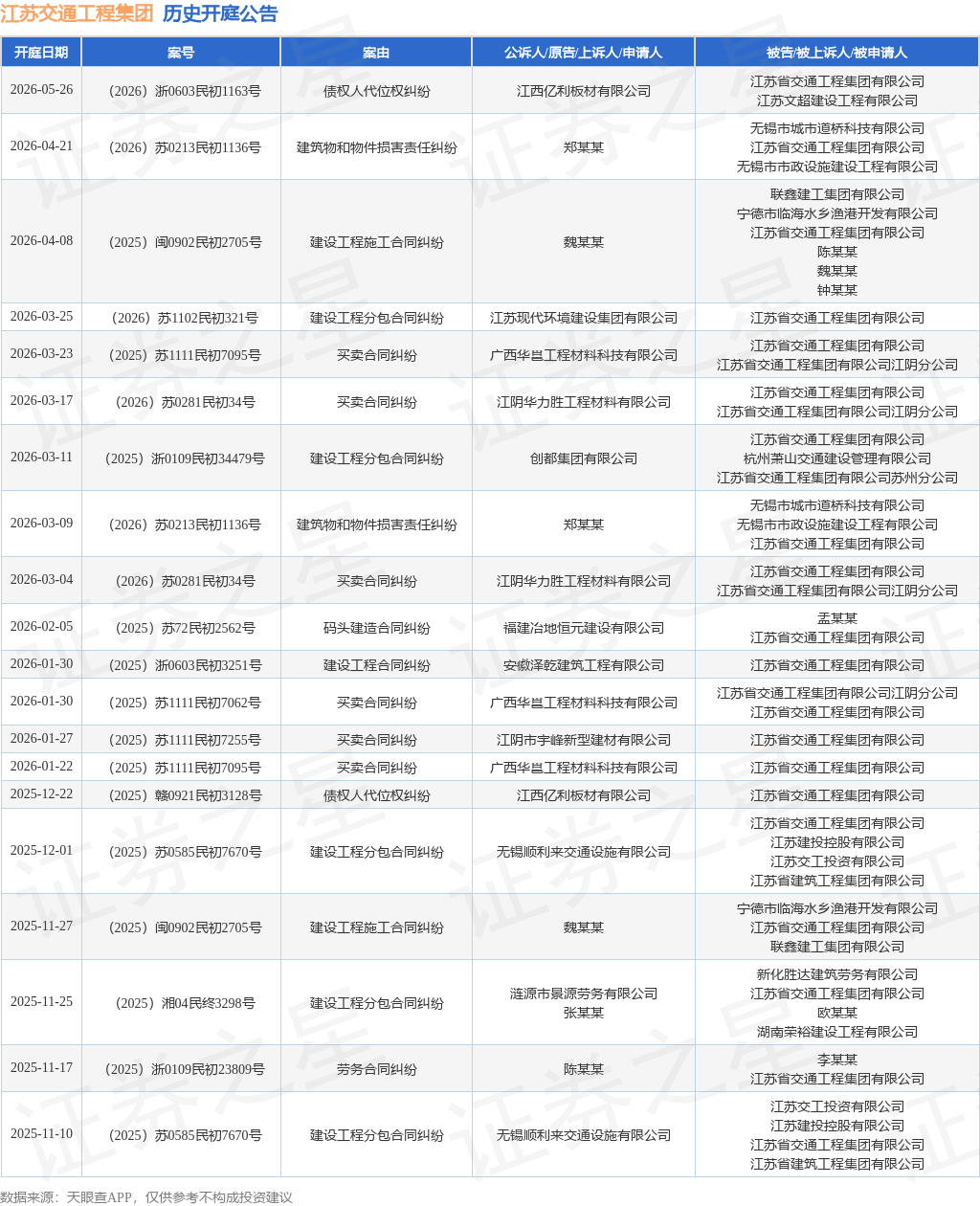 案号:(2026)苏0213民初1136号根据统计,近一年内以江苏省交通工程集团有限公司为当事人的历史开庭公告有93则,其中案由为“买卖合同纠纷”的公告以22则居首,其次为“建设工程施工合同纠纷”有15则,“劳务合同纠纷”有11则。历史开庭公告(前20条)如下: