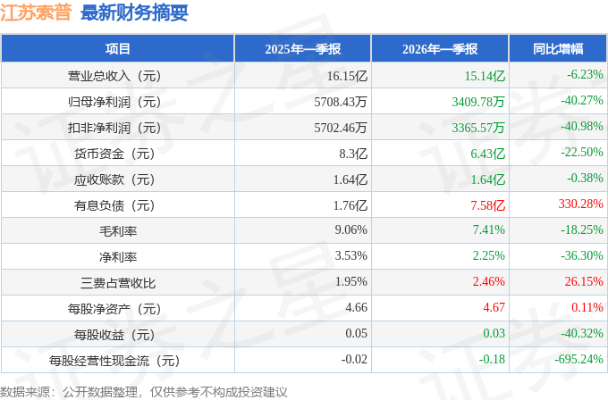 据证券之星公开数据整理,近期江苏索普(600746)发布2026年一季报。截至本报告期末,公司营业总收入15.14亿元,同比下降6.23%,归母净利润3409.78万元,同比下降40.27%。按单季度数据看,第一季度营业总收入15.14亿元,同比下降6.23%,第一季度归母净利润3409.78万元,同比下降40.27%。本报告期江苏索普公司应收账款体量较大,当期应收账款占最新年报归母净利润比达185.07%。