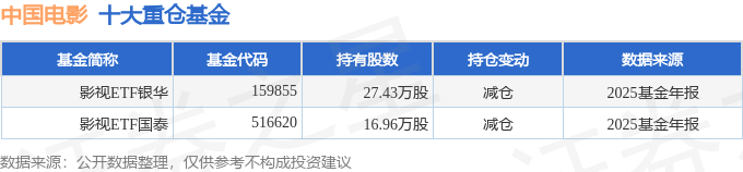 持有中国电影最多的基金为影视ETF银华,目前规模为0.99亿元,最新净值0.94(4月17日),较上一交易日上涨0.42%,近一年上涨9.61%。该基金现任基金经理为张亦驰。