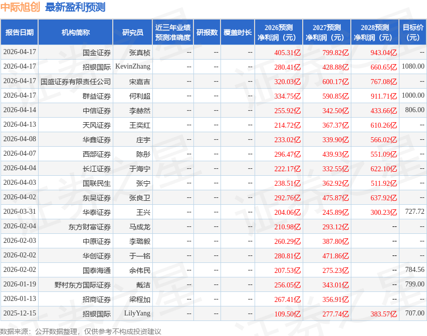 最新盈利预测明细如下: