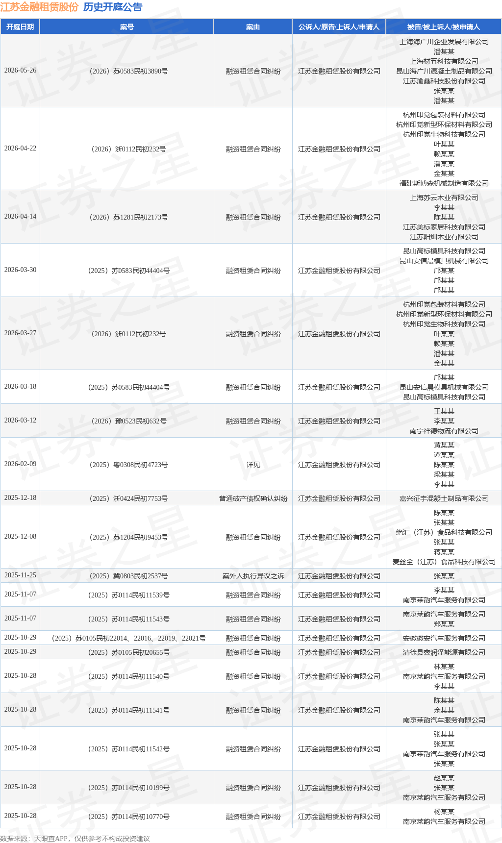 案号:(2026)浙0112民初232号根据统计,近一年内以江苏金融租赁股份有限公司为当事人的历史开庭公告有488则,其中案由为“融资租赁合同纠纷”的公告以472则居首,其次为“租赁合同纠纷”有3则,“买卖合同纠纷”有2则。历史开庭公告(前20条)如下: