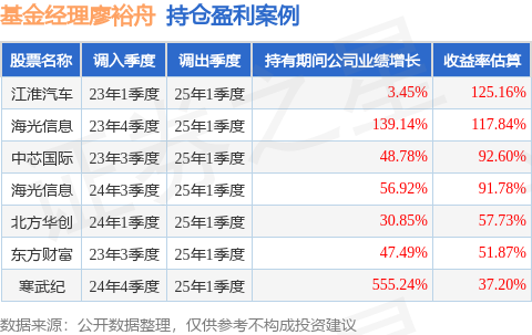廖裕舟管理的G60创新ETF申万菱信基金在23年1季度买入江淮汽车,在持有2年又0个季度后在25年1季度卖出。持有期间的估算收益率为125.16%,持有期间江淮汽车在2023年到2025年的年报营业总收入增幅达3.45%。