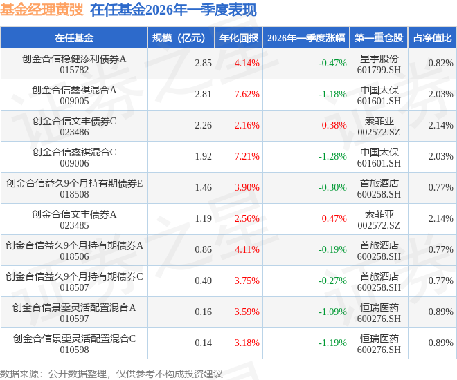 证券之星消息,截止2026年一季度末,基金经理黄弢旗下共管理10只基金,本季度表现最佳的为创金合信文丰债券A(023485),季度净值涨0.47%。