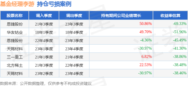 李游管理的创金合信产业智选混合A基金在21年3季度买入恩捷股份,在持有2年又0个季度后在23年3季度卖出。持有期间的估算收益率为-69.33%,持有期间恩捷股份在2021年到2023年的年报营业总收入增幅达50.86%。