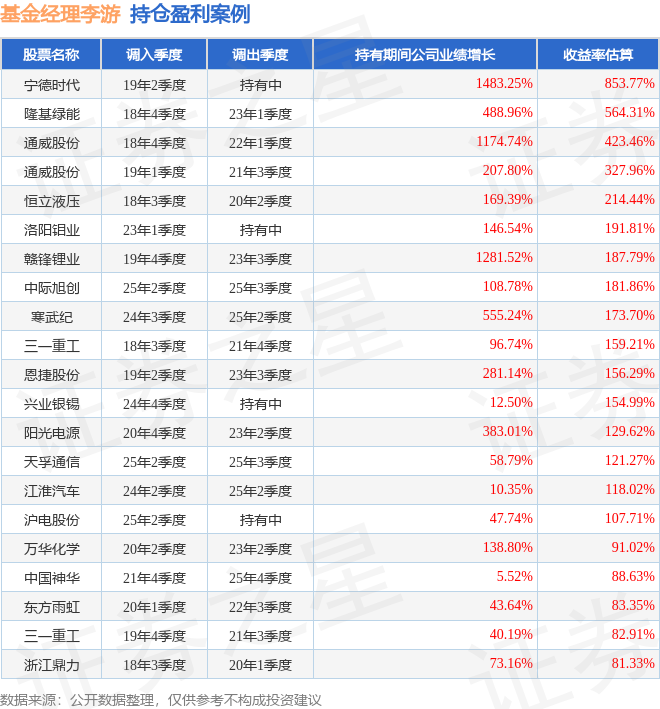 李游管理的创金合信工业周期股票A基金在19年2季度买入宁德时代,已连续持有6年又3个季度。持有期间的估算收益率为853.77%,持有期间宁德时代在2019年到2025年的年报归属净利润增幅达1483.25%。