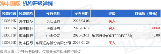 投行对该股的评级以买入为主,近90天内共有3家投行给出买入评级,近90天的目标均价为40.8港元。长江证券最新一份研报给予海丰国际买入评级。