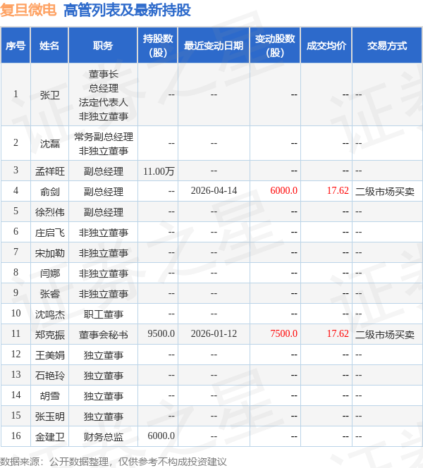 复旦微电近半年内的董监高及核心技术人员增减持详情如下: