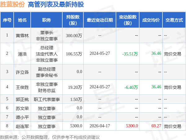 证券之星消息,根据4月20日市场公开信息、上市公司公告及交易所披露数据整理,胜蓝股份(300843)最新董监高及相关人员股份变动情况:2026年4月17日公司独立董事赵连军共增持公司股份5300.0股,占公司总股本为0.0032%。变动期间公司股价上涨1.75%,4月17日当日收盘报69.17元。