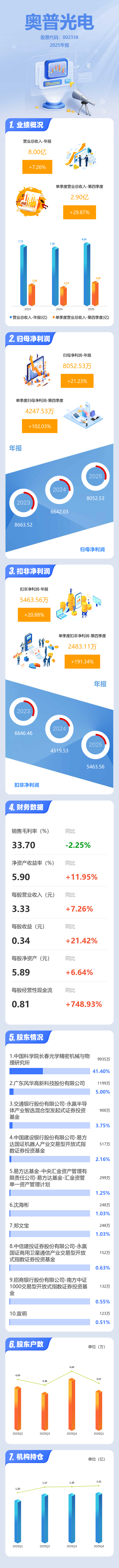证券之星消息,奥普光电2025年年报显示,当年度公司主营收入8.0亿元,同比上升7.27%;归母净利润8052.53万元,同比上升21.24%;扣非净利润5463.56万元,同比上升20.89%;其中2025年第四季度,公司单季度主营收入2.9亿元,同比上升29.87%;单季度归母净利润4247.53万元,同比上升102.04%;单季度扣非净利润2483.11万元,同比上升191.34%;负债率33.72%,投资收益7512.94万元,财务费用1139.07万元,毛利率33.7%。