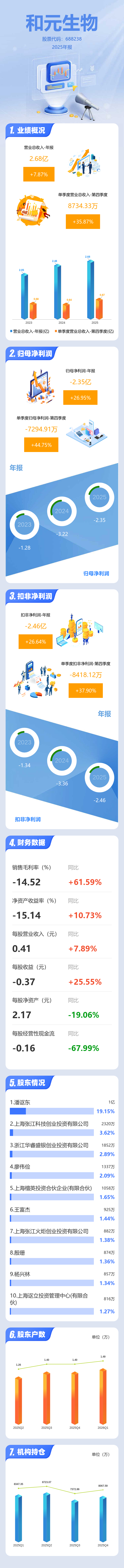 证券之星消息,和元生物2025年年报显示,当年度公司主营收入2.68亿元,同比上升7.88%;归母净利润-2.35亿元,同比上升26.96%;扣非净利润-2.46亿元,同比上升26.64%;其中2025年第四季度,公司单季度主营收入8734.33万元,同比上升35.88%;单季度归母净利润-7294.91万元,同比上升44.75%;单季度扣非净利润-8418.12万元,同比上升37.9%;负债率32.68%,投资收益608.98万元,财务费用619.35万元,毛利率-14.52%。