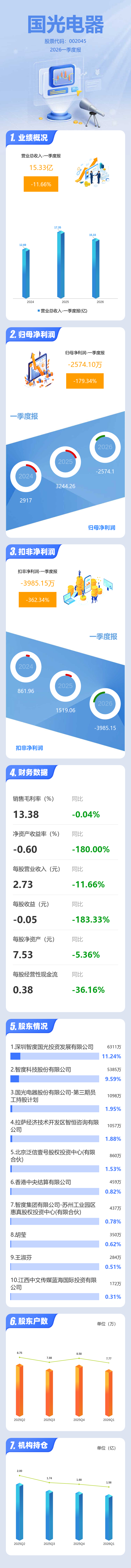 证券之星消息,国光电器2026年一季报显示,一季度公司主营收入15.33亿元,同比下降11.66%;归母净利润-2574.1万元,同比下降179.34%;扣非净利润-3985.15万元,同比下降362.34%;负债率61.71%,投资收益1702.21万元,财务费用4060.08万元,毛利率13.38%。