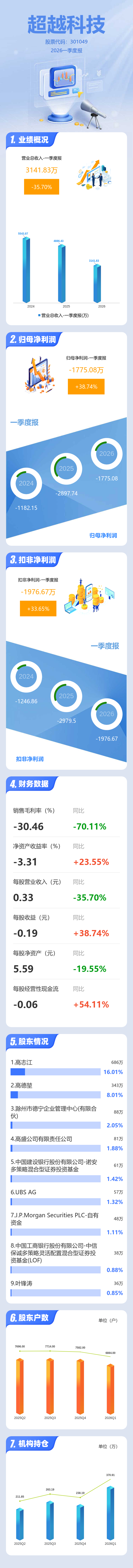 证券之星消息,超越科技2026年一季报显示,一季度公司主营收入3141.83万元,同比下降35.7%;归母净利润-1775.08万元,同比上升38.74%;扣非净利润-1976.67万元,同比上升33.66%;负债率53.38%,财务费用230.6万元,毛利率-30.46%。