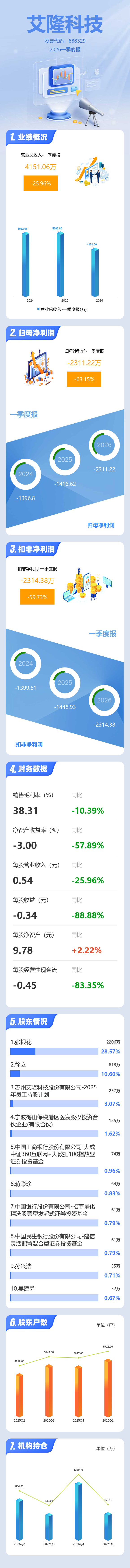 证券之星消息,艾隆科技2026年一季报显示,一季度公司主营收入4151.06万元,同比下降25.96%;归母净利润-2311.22万元,同比下降63.15%;扣非净利润-2314.38万元,同比下降59.73%;负债率42.97%,投资收益-205.93万元,财务费用82.2万元,毛利率38.31%。