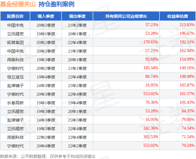 关山管理的融通新消费灵活配置混合基金在19年3季度买入立讯精密,在持有2个季度后在20年1季度卖出。持有期间的估算收益率为84.35%,持有期间立讯精密在2019年到2020年的年报归属净利润增幅达53.28%。