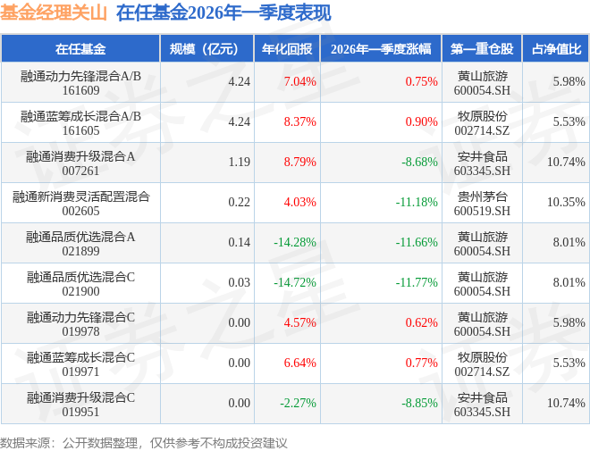 证券之星消息,截止2026年一季度末,基金经理关山旗下共管理9只基金,本季度表现最佳的为融通蓝筹成长混合A/B(161605),季度净值涨0.9%。