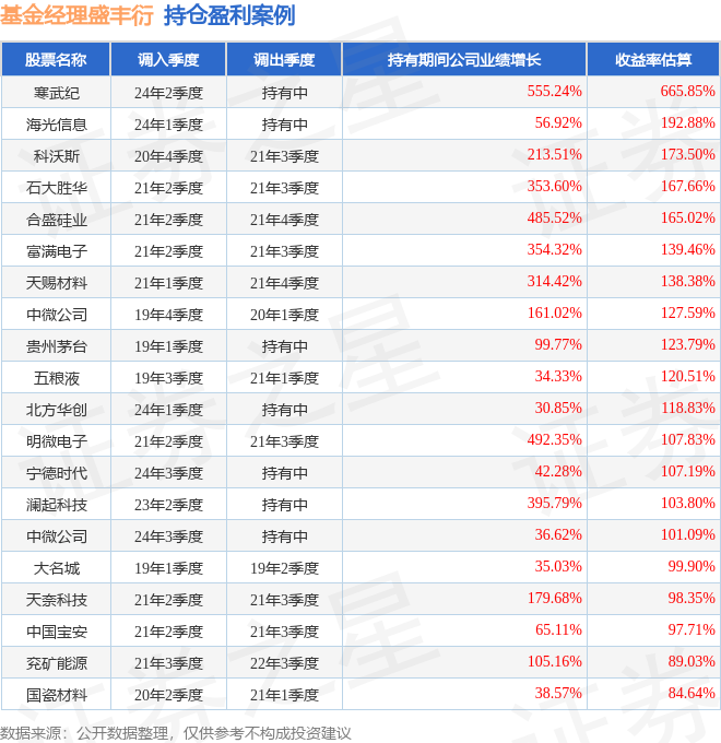 盛丰衍管理的西部利得CES芯片指数增强A基金在24年2季度买入寒武纪,已连续持有1年又3个季度。持有期间的估算收益率为665.85%,持有期间寒武纪在2024年到2025年的年报归属净利润增幅达555.24%。