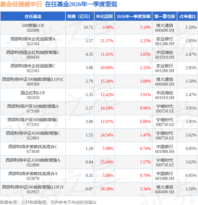 证券之星消息,截止2026年一季度末,基金经理盛丰衍旗下共管理13只基金,本季度表现最佳的为国企红利LOF(501059),季度净值涨3.91%。