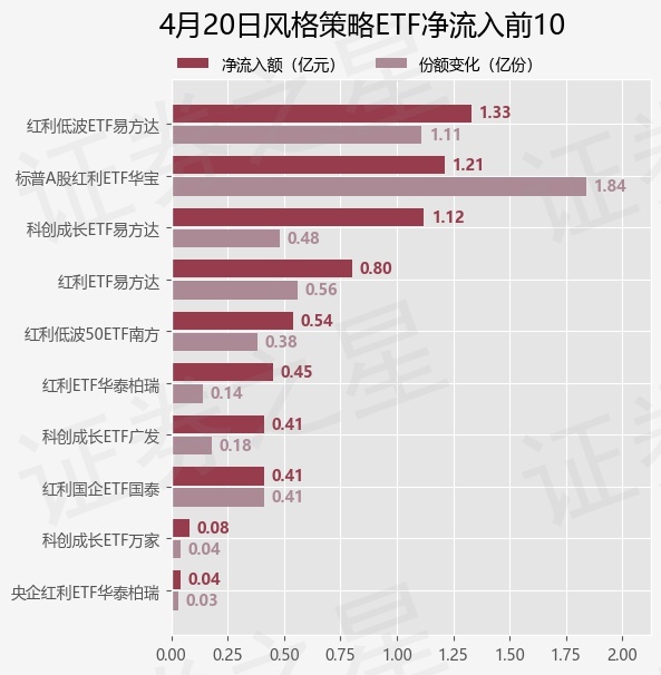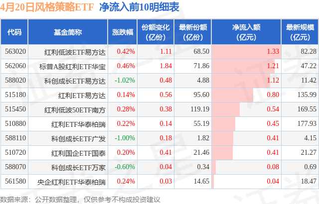 当日有12只风格策略ETF基金出现资金净流入,其中净流入排首位的是红利低波ETF易方达(563020),份额增加了1.11亿份,净流入额为1.33亿元。
