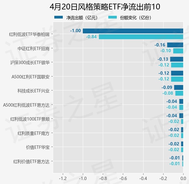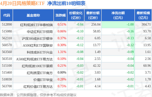当日有10只风格策略ETF基金出现资金净流出,其中净流出排首位的是红利低波ETF华泰柏瑞(512890),份额减少了8400.0万份,净流出额为9968.85万元。