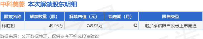 证券之星消息,根据市场公开信息整理,中科美菱(920992)于4月21日将有49.93万股限售股份解禁,为公司追加承诺限售股份上市流通,占公司总股本0.52%。(本次数据根据历史公告整理得出,实际情况以上市公司最新公告为准)最近一年内,该股累计解禁2061.98万股,占总股本的21.32%。本次解禁后,公司还有4771.37万股限售股份,占总股本49.33%。具体如下图所示: