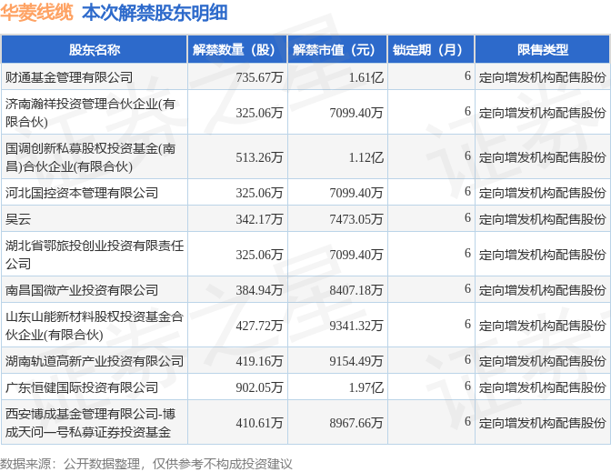 证券之星消息,根据市场公开信息整理,华菱线缆(001208)于4月21日将有5110.78万股限售股份解禁,为公司定向增发机构配售股份,占公司总股本8.01%。(本次数据根据历史公告整理得出,实际情况以上市公司最新公告为准)本次解禁后,公司还有3.2亿股限售股份,占总股本50.07%。具体如下图所示: