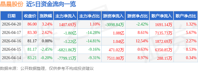 证券之星消息,截至2026年4月20日收盘,晶晨股份(688099)报收于86.0元,上涨3.24%,换手率3.6%,成交量15.16万手,成交额12.79亿元。
