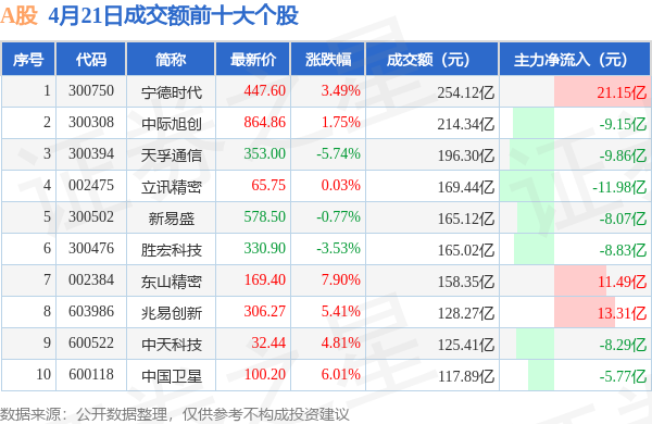 当日A股成交额前10大个股中7只个股收涨,平均涨幅4.2%,其中宁德时代(300750)以成交额254.12亿元排第一。从主力资金流入看,成交额前10大个股中有3只个股呈现主力资金净流入。