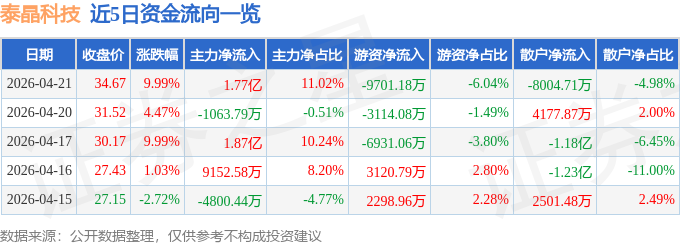 证券之星消息,泰晶科技4月21日涨停收盘,收盘价34.67元。该股于9点55分涨停,1次打开涨停,截止收盘封单资金为1.06亿元,占其流通市值0.8%。