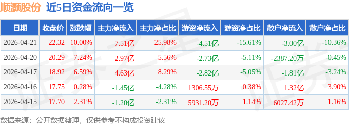 证券之星消息,顺灏股份4月21日涨停收盘,收盘价22.32元。该股于9点25分涨停,2次打开涨停,截止收盘封单资金为3.41亿元,占其流通市值1.44%。