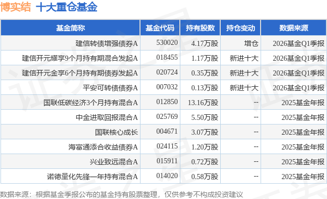 根据2026基金Q1季报公募基金重仓股数据,重仓该股的公募基金共4家,其中持有数量最多的公募基金为建信基金的建信转债增强债券A。建信转债增强债券A目前规模为0.46亿元,最新净值3.939(4月20日),较上一交易日上涨0.15%,近一年上涨30.69%。该公募基金现任基金经理为吕怡 赵荣杰。赵荣杰在任的基金产品包括:建信开元耀享9个月持有期混合发起A,管理时间为2023年8月8日至今,期间收益率为14.56%;建信多因子量化股票,管理时间为2024年1月29日至今,期间收益率为54.69%;建信鑫安回报灵活配置混合A,管理时间为2025年6月25日至今,期间收益率为45.92%;建信开元金享6个月持有期债券发起A,管理时间为2025年6月25日至今,期间收益率为3.59%。