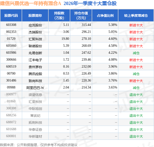 建信兴晟优选一年持有混合A的前十大重仓股如下: