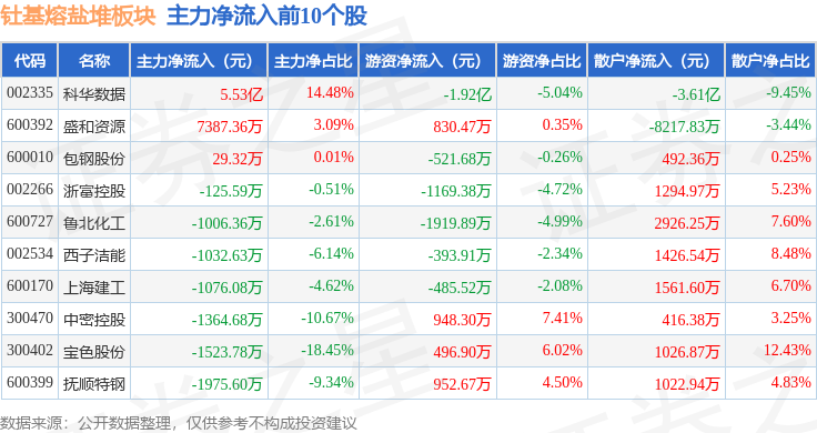 从资金流向上来看,当日钍基熔盐堆板块主力资金净流出7.05亿元,游资资金净流入759.49万元,散户资金净流入6.97亿元。钍基熔盐堆板块个股资金流向见下表: