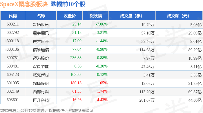 从资金流向上来看,当日SpaceX概念股板块主力资金净流出18.06亿元,游资资金净流入3.61亿元,散户资金净流入14.46亿元。SpaceX概念股板块个股资金流向见下表: