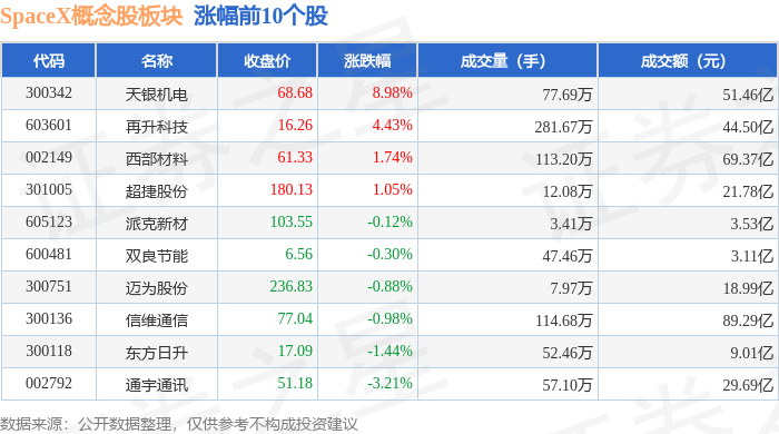 证券之星消息,4月21日SpaceX概念股板块较上一交易日上涨0.55%,天银机电领涨。当日上证指数报收于4085.08,上涨0.07%。深证成指报收于14982.14,上涨0.1%。SpaceX概念股板块个股涨跌见下表: