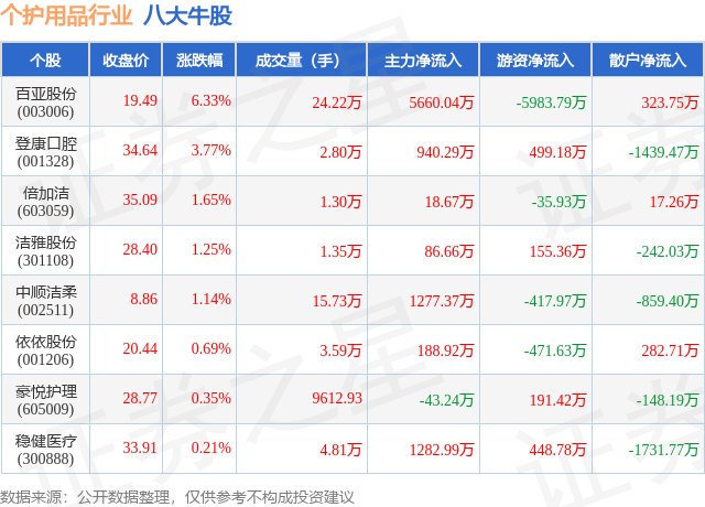 个股表现方面,个护用品行业当日领涨股为百亚股份(003006),该股当日报收19.49,上涨6.33%,成交量24.22万,主力资金净流入5660.04万元。登康口腔(001328)以上涨3.77%紧随其后,该股当日成交量2.8万,主力资金净流入940.29万元。除此之外,倍加洁(603059)、洁雅股份(301108)、中顺洁柔(002511)均进入当日牛股之列。具体个股列表见下表: