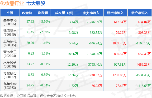 个股表现方面,化妆品行业当日领跌股为嘉亨家化(300955),该股当日报收37.63,下跌5.5%,成交量3.14万,主力资金净流出1246.59万元。锦盛新材(300849)以下跌2.59%紧随其后,该股当日成交量3.98万,主力资金净流出382.55万元。除此之外,上海家化(600315)、青岛金王(002094)、水羊股份(300740)均进入当日熊股之列。具体个股列表见下表: