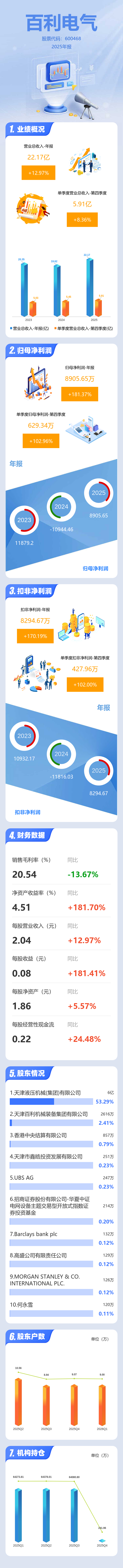 证券之星消息,百利电气2025年年报显示,当年度公司主营收入22.17亿元,同比上升12.97%;归母净利润8905.65万元,同比上升181.37%;扣非净利润8294.67万元,同比上升170.2%;其中2025年第四季度,公司单季度主营收入5.91亿元,同比上升8.37%;单季度归母净利润629.34万元,同比上升102.96%;单季度扣非净利润427.96万元,同比上升102.0%;负债率45.19%,投资收益4348.5万元,财务费用866.04万元,毛利率20.54%。