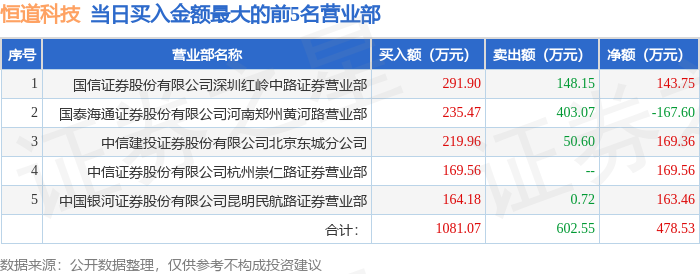 证券之星消息,沪深交易所2026年4月21日公布的交易公开信息显示,恒道科技(920177)因当日换手率达到20%的前5只股票登上龙虎榜。此次是近5个交易日内第3次上榜。