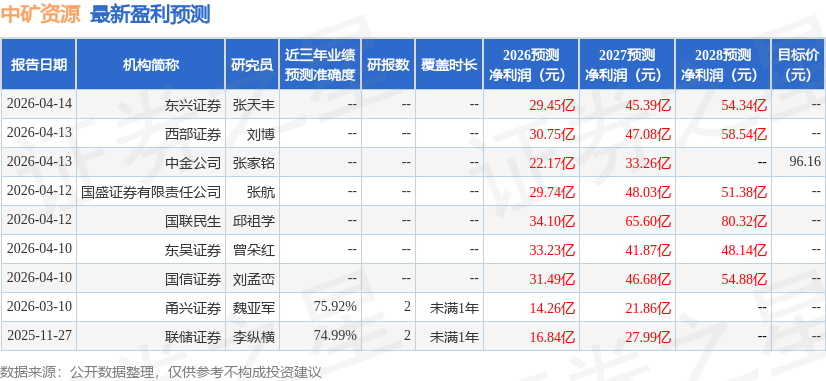 2026年4月10日,中矿资源发布2026年一季度业绩预告,预期实现归母净利润5亿元-5.5亿元,2025年同期实现盈利1.35亿元,同比增长270.97%-308.07%。
