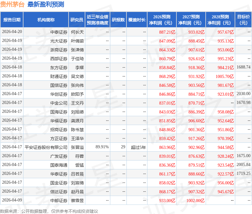 证券之星数据中心根据近三年发布的研报数据计算,平安证券股份有限公司张晋溢研究员团队对该股研究较为深入,近三年预测准确度均值高达89.91%,其预测2026年度归属净利润为盈利863.96亿,根据现价换算的预测PE为20.47。