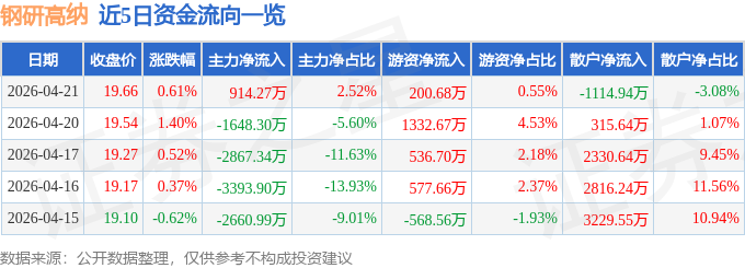 证券之星消息,截至2026年4月21日收盘,钢研高纳(300034)报收于19.66元,上涨0.61%,换手率2.4%,成交量18.41万手,成交额3.62亿元。