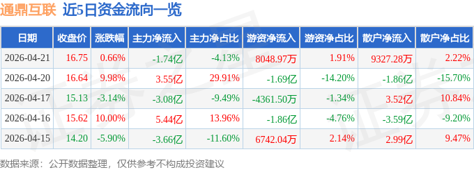 证券之星消息,截至2026年4月21日收盘,通鼎互联(002491)报收于16.75元,上涨0.66%,换手率21.28%,成交量250.33万手,成交额42.03亿元。