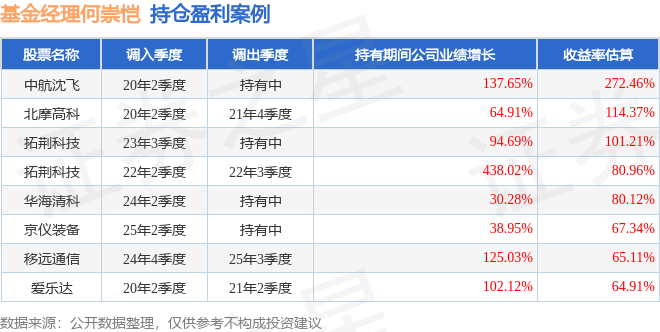 何崇恺管理的易方达积极成长混合基金在22年2季度买入拓荆科技,在持有1个季度后在22年3季度卖出。持有期间的估算收益率为80.96%,持有期间拓荆科技在2021年到2022年的年报归属净利润增幅达438.02%。