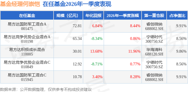 证券之星消息,截止2026年一季度末,基金经理何崇恺旗下共管理5只基金,本季度表现最佳的为易方达积极成长混合(110005),季度净值涨11.96%。