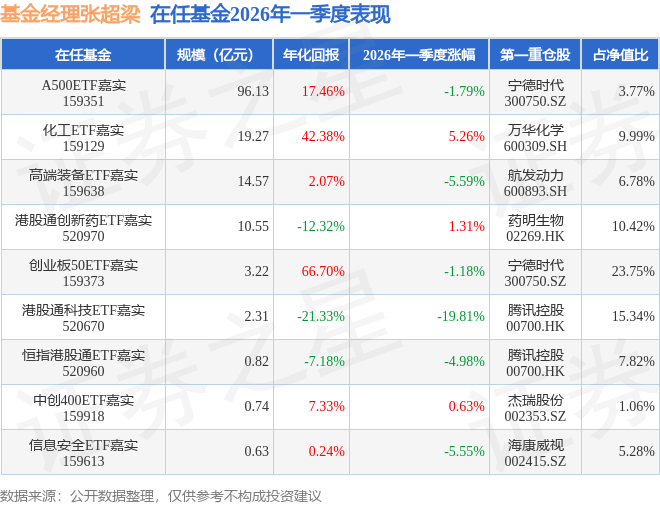 证券之星消息,截止2026年一季度末,基金经理张超梁旗下共管理9只基金,本季度表现最佳的为化工ETF嘉实(159129),季度净值涨5.26%。