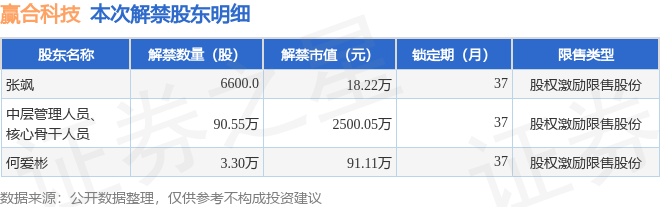 证券之星消息,根据市场公开信息整理,赢合科技(300457)于4月22日将有94.51万股限售股份解禁,为公司股权激励限售股份,占公司总股本0.15%。(本次数据根据历史公告整理得出,实际情况以上市公司最新公告为准)本次解禁后,公司还有1033.32万股限售股份,占总股本1.6%。具体如下图所示: