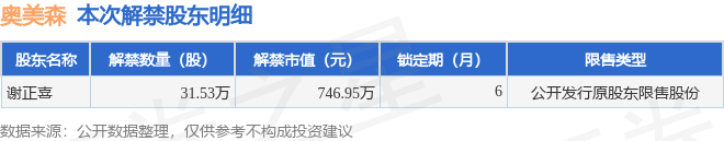 证券之星消息,根据市场公开信息整理,奥美森(920080)于4月22日将有31.53万股限售股份解禁,为公司公开发行原股东限售股份,占公司总股本0.38%。(本次数据根据历史公告整理得出,实际情况以上市公司最新公告为准)本次解禁后,公司还有6002.43万股限售股份,占总股本72.32%。具体如下图所示: