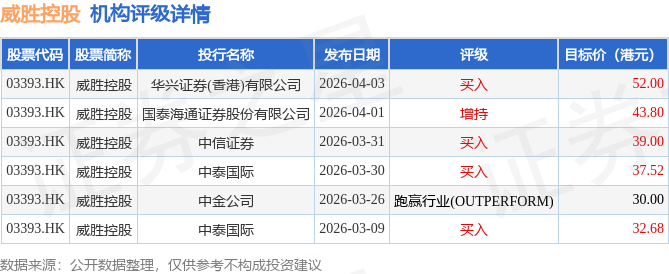 投行对该股的评级以买入为主,近90天内共有4家投行给出买入评级,近90天的目标均价为39.17港元。华兴证券(香港)有限公司最新一份研报给予威胜控股买入评级,目标价52港元。