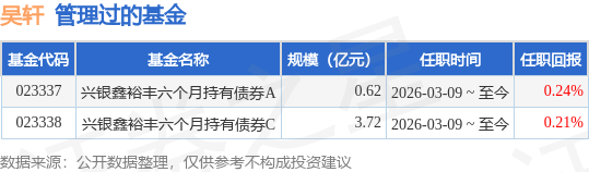 吴轩先生:中国国籍,美国南加州大学金融工程硕士,CFA/FRM,历任Alcioun Capital, LLC策略研究部分析师,兴业证券股份有限公司财务部研究分析岗,兴证证券资产管理有限公司项目经理、投资经理,上海光大证券资产管理有限公司投资经理。2025年8月加入兴银基金管理有限责任公司,现任固定收益部基金经理。2026年3月9日起任兴银鑫裕丰六个月持有期债券型证券投资基金基金经理。